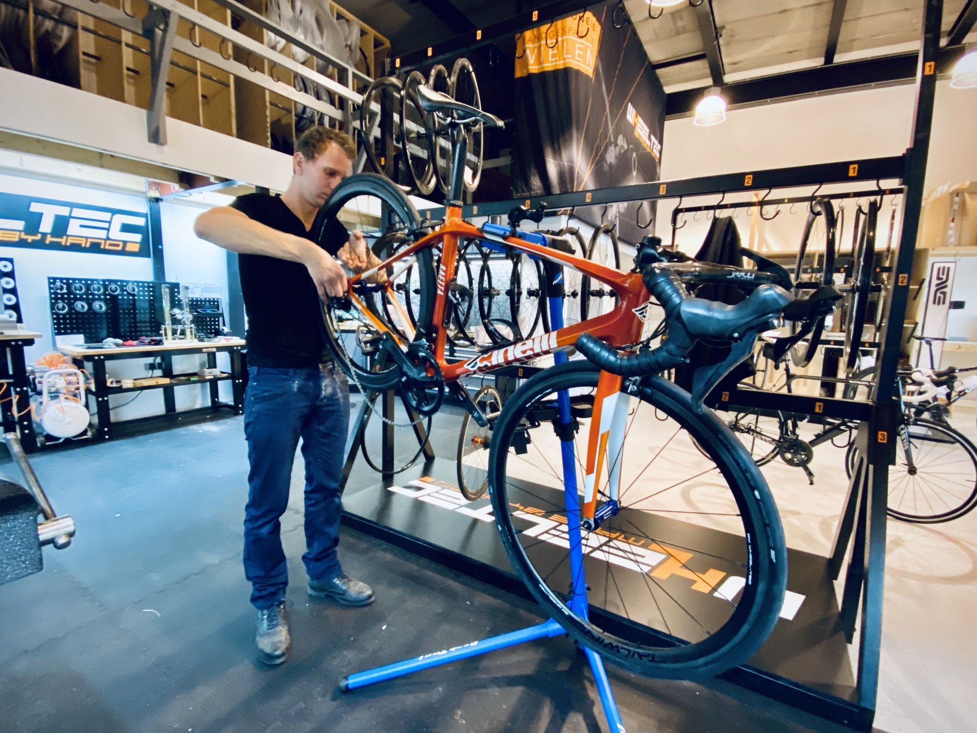Voor Leendert’s Cinelli bouwden we een set Tailwind SLS 35-40 velgen met de speciale XHM+ remlaag rond Carbon-Ti XHUB naven. Pure kunstwerkjes, deze naven: zowel qua techniek als afwerking. Wat een eyecandy is dat toch. Resultaat: een ultralichte 1272 grams wielset welke garant staat voor een zeer levendig rijgedrag. Reageert op elke trap en elke stuurbeweging: pure raketbrandstof!